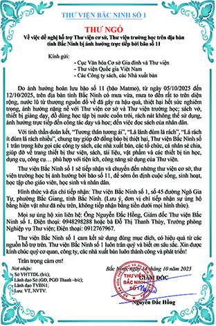 Thư viện Bắc Ninh số 1 vừa có thư kêu gọi hỗ trợ Thư viện cơ sở, Thư viện trường học trên địa bàn tỉnh bị ảnh hưởng trực tiếp bởi bão số 11.