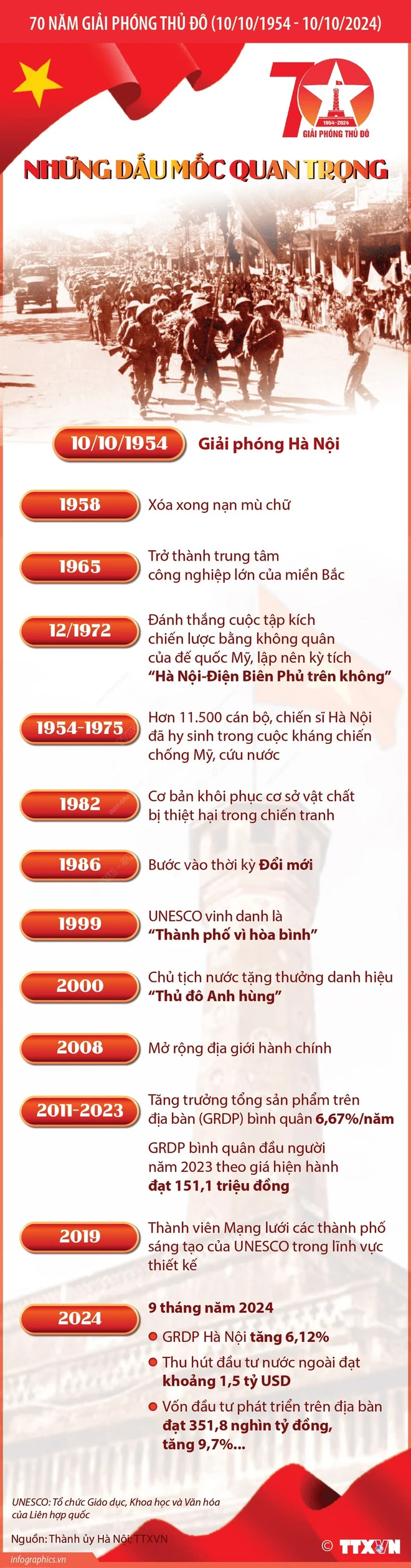 70 năm trước, ngày 10/10/1954, Thủ đô Hà Nội được giải phóng, mở đầu thời kỳ xây dựng chủ nghĩa xã hội ở miền Bắc và đấu tranh giải phóng miền Nam, thống nhất đất nước.